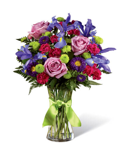 Featuring a playful and romantic look with a variety of hues and textures, this stunning arrangement is composed of royal blue irises, deep crimson mini carnations, pale lavender roses, and dark violet Matsumoto asters, all complemented by tiny grass-green poms. It comes in a slender glass vase, adorned with a lime green satin ribbon at the neck.